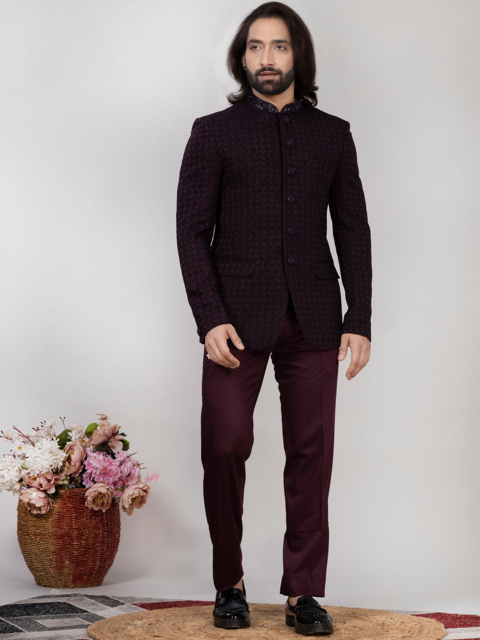 RAXON Designer Wine Jacquard Jodhpuri Suit